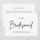 Laden Sie Ihre Brautmädchen stilvoll mit unserem Minimalistischen Chic zu meiner Brautjungfrau Hochzeitsfeier ein. Diese elegante Einladung besticht durch ein gepflegtes Design mit edler Typografie, die sich perfekt eignet, um Ihren Hochzeitstag mit einem raffinierten Ton zu gestalten. Die minimalistische Ästhetik erlaubt es Ihnen, Ihre herzliche Botschaft zu glänzen, und macht sie zu einem unvergesslichen und stilvollen Weg, Ihre Freunde fragen, an Ihrer Seite zu stehen. Personalisieren Sie es mit Ihren Hochzeitsdetails und eine besondere Note für jede Brautjungfrau. Für kundenspezifische Designs und mehr Bridal Schreibwaren, kontaktieren Sie uns oder folgen Sie uns für die neuesten Updates.