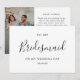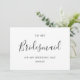 Für einen "Minimalistischen Chic To My Bridesmaid Wedding Day Dankeschön Card", stellen Sie sich eine Karte mit einem weichen, neutralen Hintergrund vor, vielleicht in einem rot oder elfenbeinfarbenen Ton. Die Vorderseite könnte ein einfaches, elegantes Skript enthalten, das "Danke" mit "Bridesmaid" direkt darunter in einer kleineren, zarten Schrift sagt. Ein minimalistisches, florales oder geometrisches Design könnte die Kanten hervorheben und den Fokus auf die Botschaft behalten haben. Im Inneren wird eine kurze, herzliche Dankesnotiz in reiner Typografie geschrieben, die ausdrückt, wie viel ihre Unterstützung an diesem besonderen Tag bedeutet. Das Gesamtbild ist modern, schlicht und ohne Mühe elegant.
