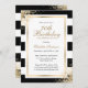 Elegante Einladung zum Geburtstag in Schwarz und Gold mit Geburtstagsdetails in einem goldenen Rahmen vor einem schwarz-weißen Hintergrund mit goldenen Konfetti. Einladung zum Geburtstag in Schwarz und Gold. Schwarz-Weiß-Einladung zum Geburtstag. Personalisieren Sie diese Vorlage ganz einfach an jede Geburtstagsparty.