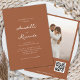 Überraschen Sie Ihre Lieben mit dieser eleganten Hochzeitseinladung, mit Terrakotta Rosthintergrund, individuellem Foto, Text & qr Code Ihrer Wahl. Fügen Sie einfach Ihre eigenen Daten hinzu, indem Sie auf die Option "Personalisieren" klicken.