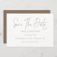 Minimalistisches Skript Brauner Text Save the Date. Verfügbar in digitaler Form und gedruckt. Einfache Eleganz mit hellbrauner Schrift. Save the Date befindet sich in einem modernen Set-Skript. Die Erholung des Textes können Sie leicht personalisieren.