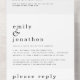 Minimalistischer zeitgenössischer Text, jede Farbhochzeit. Einfach Siegel und senden - kein Umschlag erforderlich. Zeitgenössischer minimalistischer Stil, um Ihren Gästen alle Informationen, die sie für Ihren Hochzeitstag, mit dieser Einladung, und bequeme Antwort-Karte mit Ihren Rücksendeadresse-Details, alle in einem gerollt und die Möglichkeit, die Empfänger Namen und Adresse auch. Bitte bestellen Sie jede Einladung separat, wenn Sie die Möglichkeit nutzen möchten, jede Einladung mit dem Namen und der Adresse Ihrer Empfänger zu personalisieren, um diese per Hand retten. TIPP: Füllen Sie zuerst die Erholung der Einladungsdetails aus und geben Sie hier Ihren Namen und die Adresse Ihres ersten Empfängers an. Nachdem Sie Ihre erste Einladung in Ihren Warenkorb aufgenommen haben, können Sie auf das Bild in Ihrem Warenkorb klicken, das Sie zum Produkt zurückbringt und dann einfach Ihren nächsten Empfänger-Namen und Ihre Adresse hinzufügen. Es wird die vorherigen nicht schon in Ihrem Warenkorb überschreiben. BITTE BEACHTEN SIE, dass Sie diesen Text löschen können, wenn Sie lieber in loser Schüttung bestellen möchten, und Ihren Empfängernamen und Ihre Adressdaten nach Erhalt hinzufügen. Wenn du Hilfe brauchst, dann melde mich bitte.