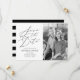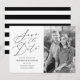 Verkünden Sie Ihre bevorstehende Hochzeit im Stil mit unserem Minimalistischen Kalligraphie-Foto speichern Sie die Daten. Die Vorderseite der Schwarz-Weiß speichern Sie die Dattelkarten mit den Worten "Save the Date" in einem eleganten Kalligrafieschrift mit Ihren Namen, Hochzeitstermin, Ort und Ihrem Lieblings-Verlobung-Foto. Auf der Rückseite des Speichers sind schwarz-weiße Streifen zu sehen.