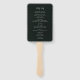 Ein einfaches, dunkelgrünes Set von Hochzeitsfans kann mit den Namen der Braut und des Bräutigams personalisiert werden, ebenso wie mit Informationen über die Zeremonie und die Hochzeitsfeier.