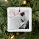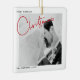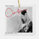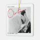 Erinnern Sie sich an Ihr erstes verheiratetes Weihnachtsfest für immer mit diesem modernen, minimalistischen Schwarz-Weiß-Weihnachtsschmuck, das mit "Weihnachten" in der modernen roten Hand gezeichnete Typografie und Ihr Lieblings-Hochzeitsgeschenk-Foto besticht. Das Foto wird auf der Rückseite wiederholt, wobei die Einzelheiten des Hochzeitdatums überlagert werden. Copyright Anastasia Surridge für The Christmas Shop, alle Rechte vorbehalten.