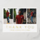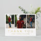 Minimalistischer Typ Abschluss flache Dankkarte mit mehreren Fotos. Die Vorderseite hat eine drei Foto Collage mit "Danke" in großen Buchstaben zusammen mit dem Namen des Absolventen in echter Goldfolie. Die Rückseite hat Ihre persönliche Nachricht. Diese moderne und einfache Dankkarte ist perfekt für einen Schulabgänger.