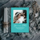 Minimalistisches Foto Ankündigung Datum freihalten mit einem frischen und schlichten quadratischen Foto Ausschnitt-Design in aquamarin. Fügen Sie ein Foto und Ihre Hochzeitsdetails zu anpassen. Dünne weiße Streifen schmücken den hinteren Teil der Einladung. Hintergrundfarbe auf der Rückseite der Einladung kann geändert werden, um das Foto zu ergänzen oder Ihre Hochzeitsfarbe hinzuzufügen.