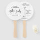 Moderner Hochzeitsprogramm Handfan mit einem einfachen Design mit Ihren Namen in einer eleganten Skripttypografie und Ihre Veranstaltungsdetails in einem minimalistischen Sans Serif Schriftart. Alle Designelemente sind schwarz und weiß. Dieses schicke Hochzeitsprogramm Hand Fan funktioniert gut mit jedem Stil der Hochzeit.