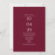 Ein modernes minimalistisches Design mit Ihrem besonderen Datum und Ihre Hochzeitsdetails Set in klassischer, schicker Typografie auf bordeauxrotem Hintergrund. Mit all Ihren besonderen Hochzeitstag Informationen auf der Rückseite, einschließlich Ihrer UAWG, Unterkunft und weitere Details. Entwickelt von Thisisnotme©
