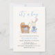 Moderne minimalistische "es ist ein Junge" Kinderzimmer Babydusche Thema, Design mit Aquarellkaninchen in blauem Tuch und seine Babywagen. In dieser Kollektion finden Sie Babydusche, Babydusche und Party. Passen Sie Ihr eigenes Wort und Ihre eigene Farbe mit dem Editing-Design an.