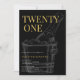 Moderne minimalistische Party Einladung zum 21. Geburtstag mit stilvollem Goldtext Sprichwort Twenty One und Ihre Party-Details in klassischen Serif-Schriftart auf schwarzem Hintergrund, einfach und elegant, große Überraschung Erwachsenenstein Geburtstagseinladung für Männer und Frauen. Die schwarze Hintergrundfarbe kann in eine beliebige Farbe geändert werden, ebenso eine Champagnerflasche in einem hellgrauen Eimer.