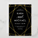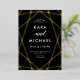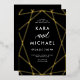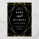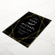 Diese stilvolle Hochzeitseinladung besticht durch eine goldene Folie, modernes geometrisches Design auf dunklem, moody schwarzem Hintergrund mit eleganter Kalligrafie.