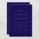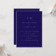 Eine minimalistische Hochzeitseinladung in reichhaltigem Mitternachtsblau mit sauberer weißer Typografie und einem raffinierten Monogramm. Der tiefe Farbton und das moderne Layout schaffen ein elegantes, zeitloses Aussehen, das perfekt für formelle oder zeitgenössische Feiern ist. Ideal für Paare, die unterschätzte Raffinesse mit einer kühnen, modernen Note lieben.