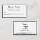 Diese schwarz-weiße Referenzkartenvorlage enthält Text, den Sie bearbeiten können. Diese weißen Karten haben einen schwarzen Rand. Es gibt Zeilen, um den Namen des Freundes und die nach Namen verwies zu schreiben. Auf der anderen Seite befindet sich ein Display-Bild, das Sie durch Ihr Logo ersetzen und Text für Ihre Kontaktinformationen anzeigen können. Der gesamte Text ist schwarz. Alle Texte können bearbeitet oder gelöscht werden.