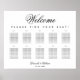 Eine einfache, minimalistische Sitzkarte mit 10 Tischen, die für eine Hochzeit empfohlen wird, aber für jede andere Feier verwendet werden kann. Der Hintergrund ist weiß. Der gesamte Text ist schwarz. Das Wort Willkommen im oberen Teil und die Braut- und Bräutigam-Namen im unteren Teil sind in einem eleganten kalligraphischen Skript geschrieben, die Erholung in Kappen.