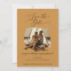 Einfaches, minimalistisches Design mit einem warmen Senfgold, bernsteinfarbenem Hintergrund mit einem Aquarellpinselstrich, der das Foto der Verlobung individuell gestaltet. Der Titel "Save the Date" wurde mit einem eleganten Kalligraphie-Schriftart mit Schnörkeln entworfen. Diese Ankündigung wurde grafisch von Audrey Jeanne Roberts, einer international lizenzierten Künstlerin und Designerin, gestaltet.