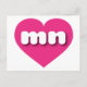Diese Postkarte zeigt ein pulsierendes, heiß rosa Herz mit den fett gerundeten, weißen Unterbuchstaben mn, eine spielerische Version der Abkürzung für den Staat von Minnesota, dem Nordstar-Staat. Die Rückseite der Karte ist leer und wartet auf Ihren individuellen Text oder handgeschriebene Stimmung.