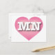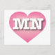 Diese Postkarte zeigt ein ruhiges, cooles und eingefangen rosa Herz mit einem weiß gewaschenen Zentrum mit den fett, weiß, Großbuchstaben MN, die offizielle Abkürzung für Minnesota, den Nord-Stern-Staat. Die Rückseite der Postkarte ist leer und wartet auf Ihre handgeschriebenen Stimmungen oder Ihren personalisierten Text.