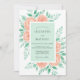 This design features a soft watercolor palette of mint green and peach. Delicate peach roses are nestled among lush sage green leaves and sprigs of greenery. The aesthetic is romantic and airy, perfect for a sunny spring outdoor event. The artistic brushstrokes create a gentle, natural atmosphere.