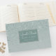 Hübsches Hochzeitsgast-Buch in einem minzgrünen Ober mit einer Grafik von minzgrün Glitzer. Ein dunkelgrüner Textbereich auf der Vorderseite des Gästebuches enthält einen weißen Text, der individuell angepasst werden kann. Die passenden Hochzeitsprodukte stehen zur Verfügung.