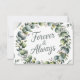 Eine zarte Hochzeitsgrusskarte mit einem schön detaillierten Eukalyptuskranz in den Farben Minzgrün und Salbei Grün, umgeben von einem subtilen, strukturierten weißen Hintergrund. Der Kranz besteht aus zerstreuten Säuglingsaugen und winzigen perlenartigen Akzenten, die ein elegantes und leicht rustikales Ambiente schaffen, das durch ein sanftes Glühen den Aquarelleffekt verstärkt. In der Mitte des Kranzes wird der Text "FOREVER & IMMER" in einem fließenden, modernen Drehbuch-Schriftart in einem weichen silbergrauen, die natürlichen Farbtöne ergänzen und ein Gefühl zeitloser Romantik hervorrufen. Das Interieur der Karte bietet viel Platz für eine herzliche Botschaft und enthält eine vereinfachte eukalyptus-Schriftzeichen-Abbildung in der unteren Ecke, die den ruhigen und feierlichen emotionalen Ton bewahrt.