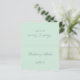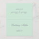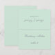 Eine schlichte grüne Hochzeitsfeier mit dem Namen des Gastes und der Tischnummer, die auf der Vorderseite gedruckt ist, den Braut- und Bräutigamen und dem auf der anderen Seite gedruckten Hochzeitsdatum (d.h. die andere Hälfte, bevor sie zusammenfällt). Der gesamte Text ist grau kalligrafisch. Größe: 4,5" x 5,6" vor dem Falten, das sind 4,5" x 2,8" nach dem Falten.