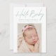 Moderne Geburtsankündigungskarte mit "Hello Baby" in einem dunkelgrünen Unterschriftsskript mit dem Namen, den Geburtsstatistiken und dem unten angezeigten Foto. Die Geburtsankündigungskarte des Fotos kehrt zurück, um ein zusätzliches Foto und eine persönliche Nachricht mit einem Hintergrund aus Pfefferminz und weißem Polka-Punkt anzuzeigen.