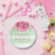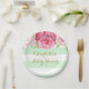 Party Teller mit individuellem Namen für Mädchen mit Duschbrause in hellpastellfarbenen Minzgrün und weißen Streifen mit Vintag rosa Blume.