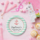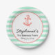 Minzgrüne Streifen mit korallenrosa nautischer Anker Geburtstagsparty Papier Platte. Das Design besteht aus einem minzgrün-weiß gestreiften Muster, einem weißen Kreis mit einem korallenrosa Anker und Ihrem eigenen Text.