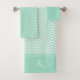 Stilvolles Set für Badehandtücher in Minzgrün und Weiß, mit Polka-Punkten und Zickzack Mustern, die das Badetuch und das Handtuch schmücken. Das Waschlappen wird in einem massiven Minzgrün gemacht. Personalisieren Sie das weiße 1-Buchstaben-Monogramm, auf dem Handtuch, um Ihre Bedürfnisse Anzug.
