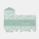 Natürliche Pfefferminzgrün Leinenbedeckung und Vintage, weiße Blumenspitze, Hochzeitsvorlage Geschenkboxen. Vorschlag für einen Text in weiß und dunkelbraun