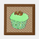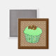 Magnet wie ein Cupcake mit grünem Pfefferminz-Zuckerguss mit Schokoladenwürfeln, in einem dekorativen, grünen Fraktal-Kuchenwickler, auf einem braunen und beigen gemusterten Hintergrund