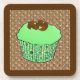Kuchen mit grünem Pfefferminz-Zuckerguss, mit Schokoladenwürfeln überzogen, in einem dekorativen, grünen Fraktal-Kuchenwickler, auf einem braunen und beigen Untersetzer mit gemustertem Hintergrund