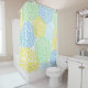 Der Duschvorhang ist in prächtigem Pfefferminzgrün, Gelb und Blau gehalten.
