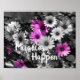 Fröhliche lila afrikanische Gänse in Schwarz und Weiß mit teilweise Farbe Blumenbild mit den inspirierenden Worten Miracles passieren. Blumenfotografie von Susan.