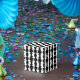 Ein lustiges Design für Groß und Klein. Dieses schwarz-weiße Gefälligkeitsfeld zeigt das gespiegelte Bild eines Geistes in einem sich wiederholenden Muster. Der schwarze Hintergrund kann angepasst werden.