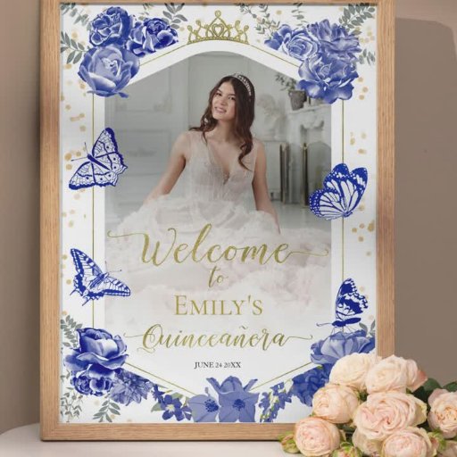Erleben Sie das Wesen Ihrer Quinceañera-Feier mit unseren Tiara- und Schmetterlingsthemen-Einladungen zum Foto. Zauberhafte Erinnerungen mit königsblauen Blumendesigns in Aquarellfarbe, die mit funkelnden Konfetti verwoben sind und alle in einem modernen geometrischen Rahmen untergebracht sind. Diese bezaubernden Einladungen werden den Ton für ein unvergessliches Meilenstein-Fest Set.