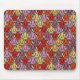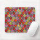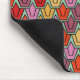 Dieses Mauspad hat ein Art Deko Design von Tulpen aus Pentagons und Trapeziden in Orange, Rot, lila, Gold und Grün.