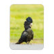 A striking portrait of a mischievous black cockatoo, captured with expressive detail and personality. The close-up photograph highlights the bird’s intelligent gaze and textured feathers.