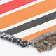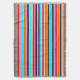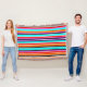 Die Decke hat ein einfaches Design von vertikalen Streifen mit unterschiedlichen Stärken in Rot, Orange, lila, Schwarz, Hellblau und Weiß.