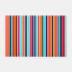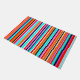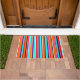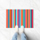 Diese Türmatte hat ein einfaches Design von vertikalen Streifen mit unterschiedlichen Stärken in Rot, Orange, lila, Schwarz, Hellblau und Weiß.