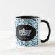 Diese zweifarbige Tasse hat einen schwarzen Stift und ein schwarzes Interieur. Die blauen Farbtöne mit dem Hintergrund über der weißen Tasse sind mit den Ovalen auf beiden Seiten geschmückt, die in der Mitte der von Grau umgrenzten Ovale eine sehr hellstählerne, blaue Färbungskrone aufweisen. Personalisierter Text unter jeder Krone, damit Sie ihn anpassen können. Text Beispiel gezeigt in "Miss Montana". Passen Sie dieses Objekt an oder kaufen Sie es wie gezeigt.