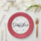 Party-Papiertafel mit lustigen kleinen Hufeisen, Symbole von viel Glück umrahmen ein Bild von einer Krone, äußere Rand Imitate Glitzer in Rot, innere Felge Golden auf weißem Hintergrund. Schwarzer Text lautet "Viel Glück". In 9" Größe angezeigt. Verkauft in Paket mit acht. Passen Sie dieses Objekt an oder kaufen Sie, wie es ist.