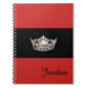 Notebook mit einem Foto-Druck von einem glänzenden Silber-farbenen Kronendruck auf schwarzem Hintergrund und einem personalisierten Namen. Notebook in Rot und Schwarz gezeigt. Passen Sie dieses Objekt an: Ändern Sie die Farbe, wenn Sie möchten, ändern Sie den Namen zu Ihrem, oder nehmen Sie den Namen aus, oder kaufen Sie wie gezeigt. Beispieltext wird als "Jordan" angezeigt.