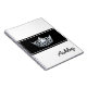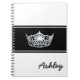 Notebook mit einem Foto-Druck einer scharf aussehenden silberfarbenen Krone auf einem schwarzen Hintergrund und einem individuelle Name. Notebook in Weiß gezeigt. Passen Sie diesen Artikel an und ändern Sie den Namen in Ihren Namen oder entfernen Sie den Namen und kaufen Sie, wie es ist.