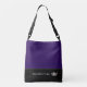 Diese niedliche, mittelgroße Crosskörper-Tasche wird in einem lila BlackBerry und schwarzen Farbblockstil mit einer Seitenkrone und eigenem Text gezeigt. Dünner Akzent Streifen. Passen Sie dieses Element an und ändern Sie den Text in Ihren Text.