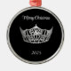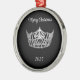 Christmas ornament is shown in a round shape with a silver color crown photo print on a and black color background.