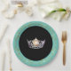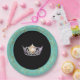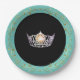 Diese festlichen Teller sind ideal, um Spaß zu haben (und sich auch leicht aufzuräumen), um sich auf der nächsten Seite zu treffen. Fügen Sie auf Wunsch Ihr Seitendesign oder Ihren Seitennamen hinzu. Hier sehen Sie einen Aqua-Türkis Blauer Rand und einen glänzenden Silber-Kronendruck in der Mitte über schicken schwarzen Hintergrund. Gold gefärbte Frills am Rand. Personalisieren oder kaufen Sie wie geplant. In 9"-Tellern dargestellt.