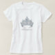 Der T - Shirt dieser Frau ist in Weiß mit Silber- und Blauer Kronenprint und elegantem Text vorne dargestellt. Hat Beispieltext von Philippinen darauf. Personalisieren Sie Ihren Namen, Ihren Namen, Ihren Titel oder eine andere Sache, die Sie sich wünschen.
