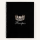 Dieses spiralförmige Rezept Notebook ist in schwarzem Schwarz mit einem Druck einer glänzenden Silber-Krone auf dem Cover gezeigt und hat ein großartiges Layout für Ihre einfache Aufnahme in Ihre eigenen Rezepte. Unter der Krone ist das Wort Rezepte in extravaganter Schrift. Rückseite schwarz mit einer kleinen Silberkrone ganz unten. Sie können dieses Notebook anpassen und aus anderen Arten von Papier und Farbe der Bindung wählen, oder kaufen, wie gezeigt.